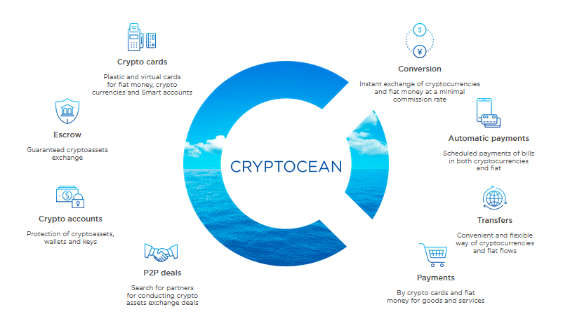 Cryptocean is a blockchain based ecosystem that combines financial and technological services for working with crypto-currencies, digital financial assets and traditional fiat money.