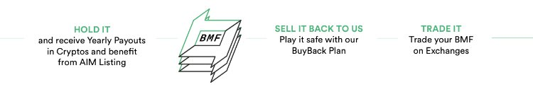 BMF Token Holders may benefit from the mining contract embedded in the BMF Token by Holding It, Trading It or participating in our Buyback Plan. Holders will benefit from yearly payouts in Cryptos that will be proportional to the amount of BMF; each Token Holder has in relation to the overall amount of BMF Tokens in circulation. BMF will be listed on selected Crypto-exchanges as well.