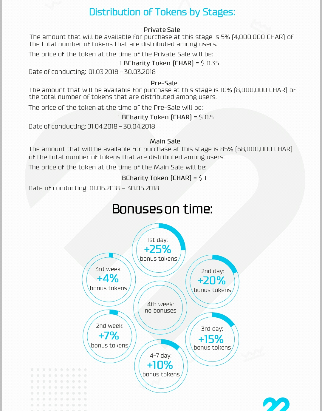 The BCharity token will be priced at 0.35 CHAR per token. The Private sale begins on March 1, 2018, to 30 March 2018 with a target of 4 million CHAR. On sales made from April 1 to April 30, 2018, BCharity wants to achieve sales targets of 8 million CHAR. This number is doubled when compared to stage I presale. This stage will determine whether BCharity can continue it's business or not. If not, then BCharity must return all the money already invested to its users. The soft cap of the presale is 5 million dollars.