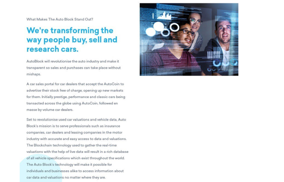 AutoBlock is a proud element, providing convenience and reliability, suitable for the automotive sector. Auto Block offers a number of unique products, but not crypto currency, which allows you to not only safely and quickly make transactions, but also gives you full access to the data, history and cost of the purchased car. Transparency for the buyer, as well as for the buyer. AutoBlock will revolutionize the automotive industry and make it transparent, which will simplify sales and purchases. Auto Block project is trying to link the automotive industry with cryptocurrency. It will enable car dealers to accept cryptocurrency as a payment option. The project has a sales portal called, “autocoinscar.com” where car dealers can sell the cars and accept cryptocurrency as a payment. This project also provides a platform for car dealers and buyers where they can access to an effective live car valuation tool. Autocoin will be the token which will be used in this platform for carrying out the transactions.