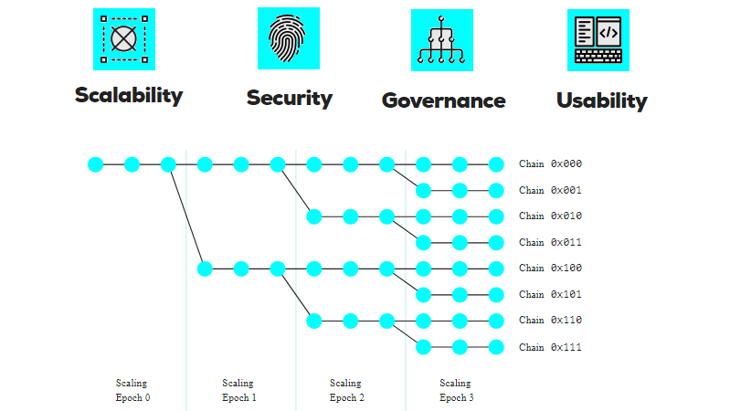 Metabase Blockchain Protocol is constructed in such a way, that it will meet the needs for the ever-increasing transactional load. For that, Metabase will adjust to new conditions with its Binary Tree Structure. This approach pertains to the next problem: Given the high transactional load, a chain splitting technology will allow for better scalability and higher speed. Thereby, each node on the blockchain contains data elements and pointers to subsegments on either sides. Each block comprises three quantities, that are chain, epoch and block numbers. At the same time, the algorithms being implemented allow for timely distribution of transactions across newly generated chains.